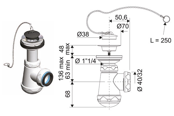 VALVULA LAVABO / BIDET 1″ 1/2 X 70 BRIXO AQUA 801386