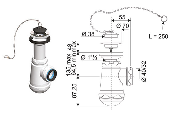 SIFON BAÑERA S/ORIENTABLE C/VALVULA Y REBOSADERO BRIXO 801409