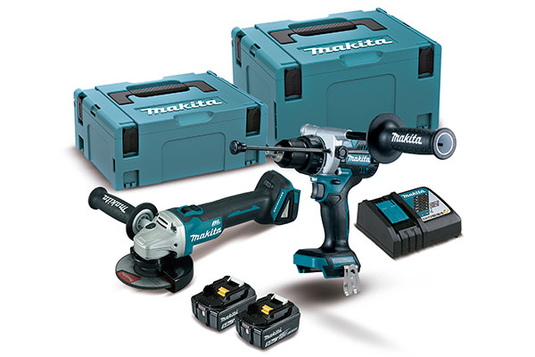 Una gama completa de dos máquinas para uso profesional. El kit incluye taladro combinado sin escobillas DHP492 y miniamoladora angular DGA504. Dos baterías de 5,0 Ah y cargador rápido en maletines Makpac.