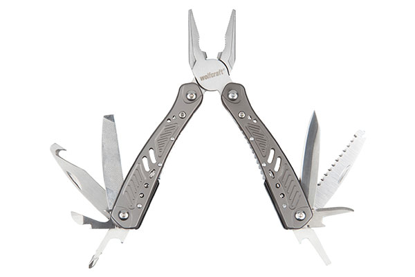 Alicates de puntas, alicates combinados, cortador de alambre, navaja, punzón, atornillador Phillips®, sierra, lima de dos caras (para madera y metal), atornillador ranura, abrebotellas, abrelatas, cuchilla garfio.