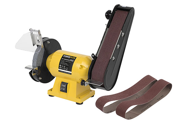 Esta herramienta 2 en 1 cuenta con una lijadora de banda, así como una amoladora de banco. Con una sola herramienta puede lijar madera y moler metal con una velocidad de rotación de hasta 2980min-1.