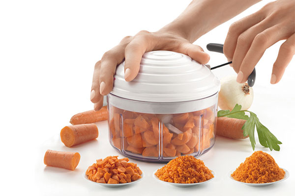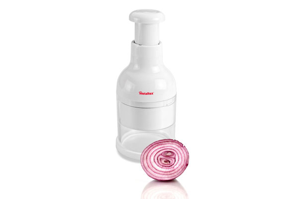 Las cuchillas giran unos grados cada vez que presionas el pulsador, lo que produce un corte uniforme. Pica rapidamente cebolla, vegetales, hierbas y frutos secos.